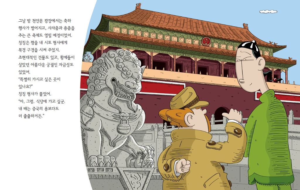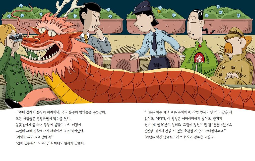 그런데 불꽃놀이를 위해 꺼졌던 광장의 불이 다시 켜지자, 치이도 씨의 모습이 보이지 않는 거예요! 단 1분 새에 사라진 치이도 씨! 천안문 광장은 너무 넓어서 1분 만에 가로질러 갈 수는 없습니다. 내일 공연을 앞둔 치이도 씨가 납치를 당하다니, 큰일입니다.