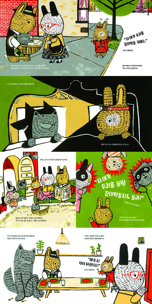 ‘토끼네’라는 문패가 걸린 집에는 엄마 아빠와 도트가 함께 살고 있습니다. 엄마 아빠는 귀가 긴 토끼입니다. 꼬마 도트도 물론 엄마 아빠와 똑 닮은 모습의 토끼지요. 그러던 어느 날 토끼 가족에게 아기 늑대가 찾아옵니다. 아기 늑대와 마주한 꼬마 토끼 도트는 덜컥 겁이 났습니다. 언젠가 늑대가 토끼 가족을 몽땅 잡아먹어 버릴 것만 같았으니까요. 하지만 엄마 아빠는 도트가 하는 걱정은 아랑곳하지 않은 채 아기에게 폭 빠져 있을 뿐이었습니다. 먹성이 좋아 뭐든지 먹어치우는 늑대는 쑥쑥 자랐고, 토끼네 집 홍당무는 결국 바닥나고 말았습니다. 이제 늑대는 무얼 먹게 될까요?