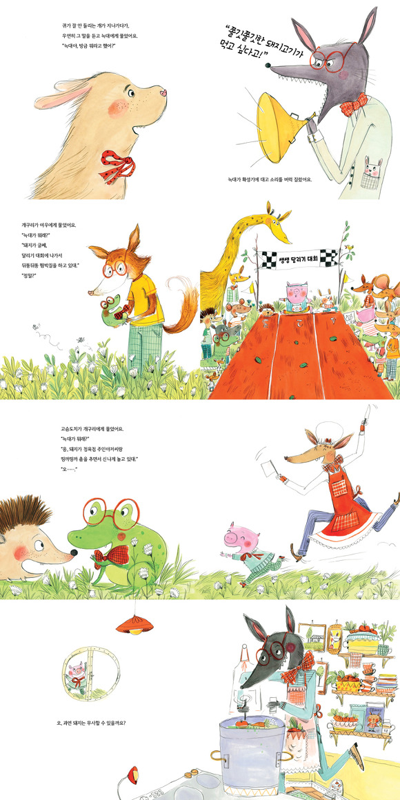 “쫄깃쫄깃한 돼지고기가 먹고 싶다.”고 중얼거린 늑대의 말이 귀가 어두운 개를 시작으로 두루미, 여우, 개구리, 고슴도치, 곰, 토끼 등등 여러 동물들에게로 차례차례 옮겨지면서, 원래와 다른 말이 덧붙여지고 또 새로운 말이 생겨나다가 급기야는 돼지를 위험에 빠뜨리게 되는 무시무시한 일이 벌어지거든요.