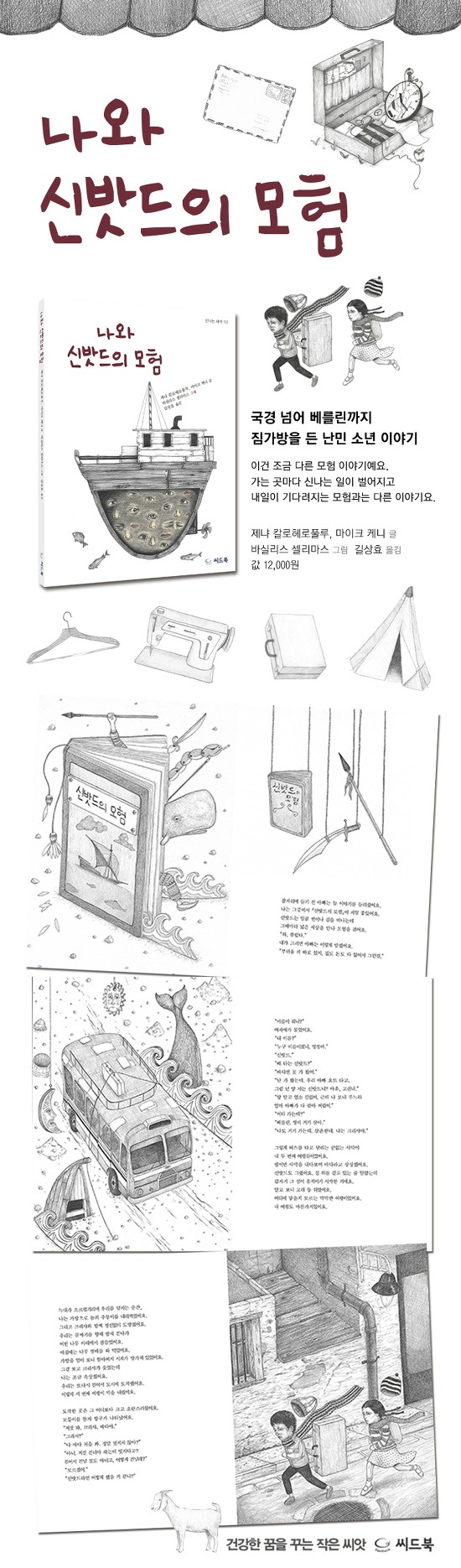 내 이름은 나즈. 엄마 아빠와 헤어져 전쟁 없는 곳으로 가기 위해 길을 나섰어. 내가 가장 좋아하는 책 『신밧드의 모험』 속 신밧드처럼 나도 일곱 번의 여행을 했지. 국경을 넘기까지 말이야.
