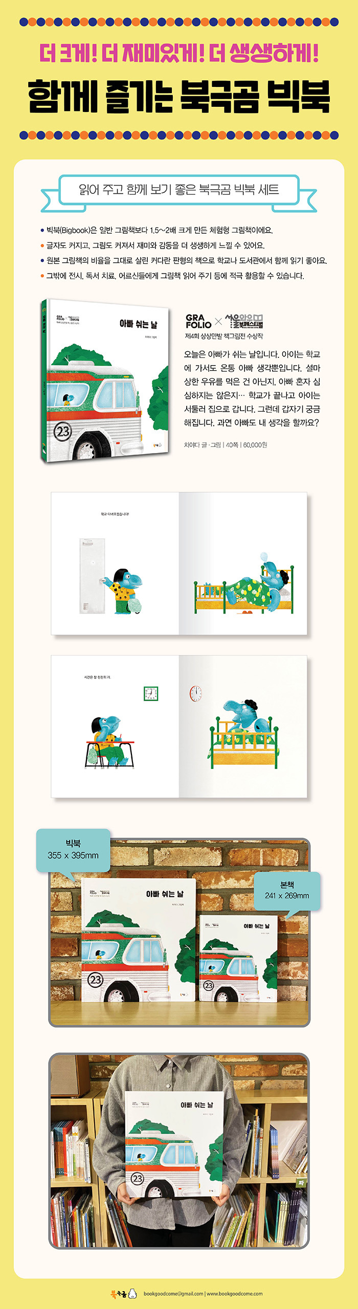 독자들에게 사랑받는 북극곰 그림책이 빅북(Big Book)으로 출간되었습니다. 빅북(Big Book)은 일반 그림책보다 1.5~2배 정도 크게 만든 체험형 그림책이에요. 글자도 커지고, 그림도 커져서 재미와 감동을 더 생생하게 느낄 수 있어요. 원본 그림책의 비율을 그대로 살린 커다란 판형의 책으로 학교나 도서관에서 읽어 주기 좋고 함께 보기에도 좋아요. 그밖에 전시, 독서 치료, 어르신들에게 그림책 읽어 주기 등에 적극 활용할 수 있습니다.