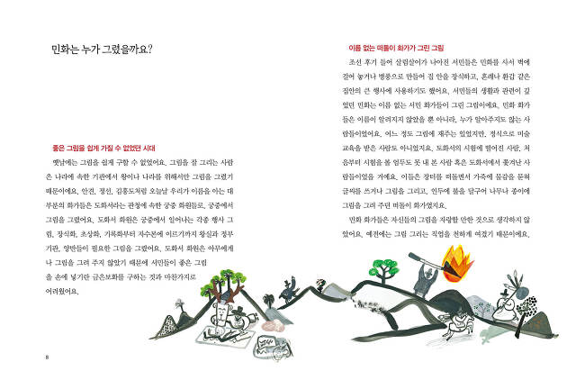 일월오봉도, 호작도, 책거리, 문자도……. 교과서 속에서, TV와 잡지 광고의 이미지로, 심지어 길거리 담장에서도 많이 보아 온 이 그림들이 대체 언제 그려진 그림인지, 왜 이렇게 현대에도 많이 보이는지, 그림에 담긴 의미는 또 무엇인지 아리송한가요? ‘민화’는 평범한 서민이 그린 그림으로, 옛사람이 기원했던 보편적인 욕구와 조상들의 다양한 예술적 감각을 담아냈습니다. 그러면서도 형식에 얽매이지 않은 자유로운 상상력으로 민화만의 독특한 매력을 그려냈지요.