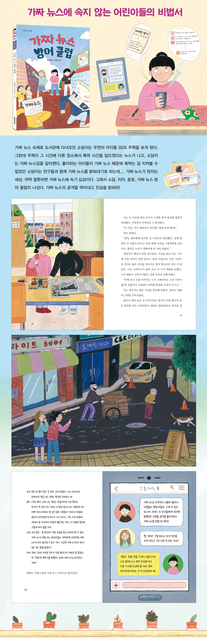 104쪽: “우리들은 뉴스 홍수 시대에 살고 있습니다. 하루에도 수백 건의 뉴스가 방송이나 신문, 인터넷 기사를 통해 전파되는데요. 우리 어린이들 같은 경우엔 사실 그런 뉴스가 진짠지 가짠지 생각하지 않고 무조건 받아들입니다. 알고 보면 어른들도 마찬가지입니다. 그래서 지금부턴 가짜 뉴스 판별법을 말씀드리겠습니다.”