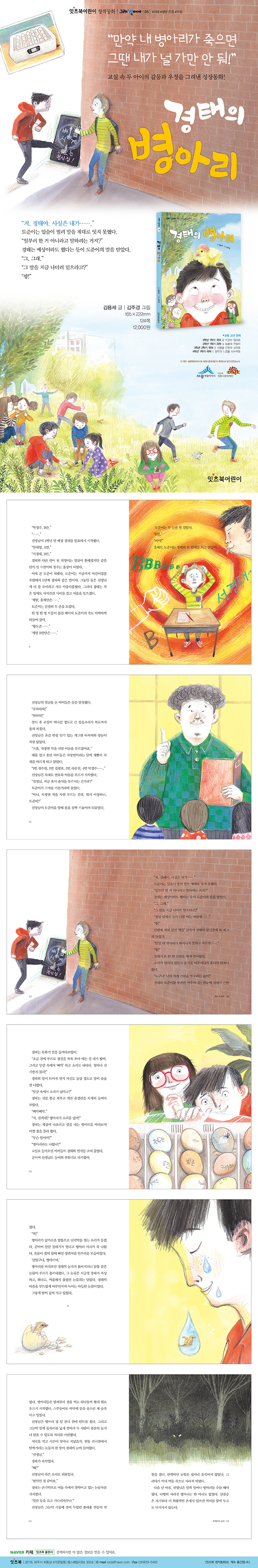 3학년의 마지막 날. 4학년 반 배정을 발표할 때 도준이는 마음을 졸입니다. 거친 말과 행동으로 친구들에게 사사건건 시비를 걸고 걸핏하면 주먹을 휘두르는 경태와 같은 반이 되기 싫어서이지요. 도준이는 유치원 때부터 지금까지 줄곧 경태와 같은 반이었고 그래서 4학년 때만큼은 경태와 헤어지고 싶습니다. 하지만 4학년도 경태와 같은 반이 되고만 도준이는 크게 실망합니다. 새 학년 첫 날, 도준이와 반 아이들은 새로 온 담임선생님이 마음에 듭니다. 인기 개그맨을 닮아서 얼굴만 봐도 웃긴 데다 바르게 앉아 책을 읽는 반 아이들 모두에게 자장면을 사 주겠다는 독특한 제안까지 하니까요. 반에 경태만 없으면 얼마나 좋을까요? 며칠 뒤 도준이는 체육 시간에 축구를 하다가 경태의 신경을 건드리게 되고 경태는 도준이에게 주먹까지 휘두릅니다. 자장면을 먹기 위해서 거짓 화해를 한 경태와 도준이. 하지만 둘의 관계는 언제 터질지 알 수 없는 폭탄 같습니다. 한편 담임 선생님은 반 아이들 모두가 참여하는 활동을 하자고 제안하고 ‘병아리 부화 수업’이 활동으로 정해집니다. 아이들은 각자 유정란을 준비해서 자기 이름을 적고 부화기에 넣습니다. 그리고 부화 과정을 지켜보면서 한껏 들뜹니다. 아이들과 선생님. 달걀이 잘 부화되고 있는지 ‘검란’을 하던 중에 도준이가 다른 친구에게 떠밀려 경태를 미는 바람에 경태의 유정란이 바닥에 떨어져 조금 깨집니다. 경태와 또다시 얽히게 된 도준이. 집에 가는 길에 경태는 도준이를 골목에 몰아넣고 자기 병아리가 태어나지 못하면 가만 두지 않겠다고 협박까지 합니다. 경태의 병아리는 무사히 태어날 수 있을까요? 또 경태와 도준이에게 무슨 일이 일어날까요?