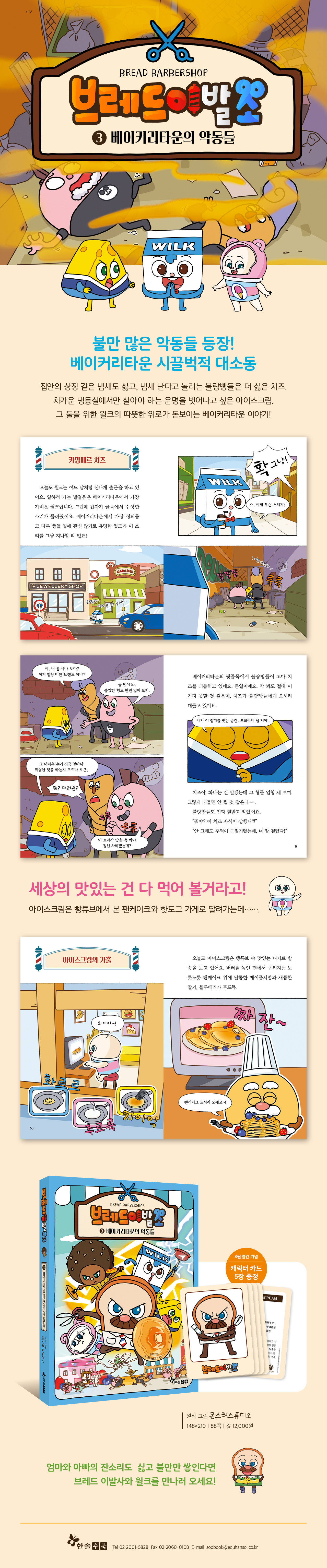시즌1에 이어 시즌2까지 이어지며 인기를 끌고 있는 애니메이션 속 에피소드가 말맛이 살아 있는 동화로 재탄생했습니다. 브레드 이발사와 베이커리타운 속 각양각색의 빵들이 만들어 내는 재미있는 이야기를 바로 옆에서 들려주는 것 같은 스토리텔링을 만나 보세요.