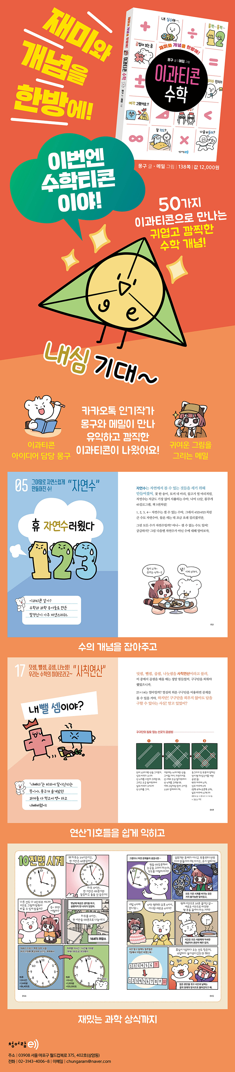 이러한 문제를 해결하는 가장 좋은 방법은 처음 등장하는 수학 기호나 용어와 친구가 되는 것이다. 유머러스한 이과티콘과 만화 스토리를 통해 수학에 대한 막연한 두려움을 떨쳐 내고 수학을 매력 있는 친구로 만들어버리면 어떨까?