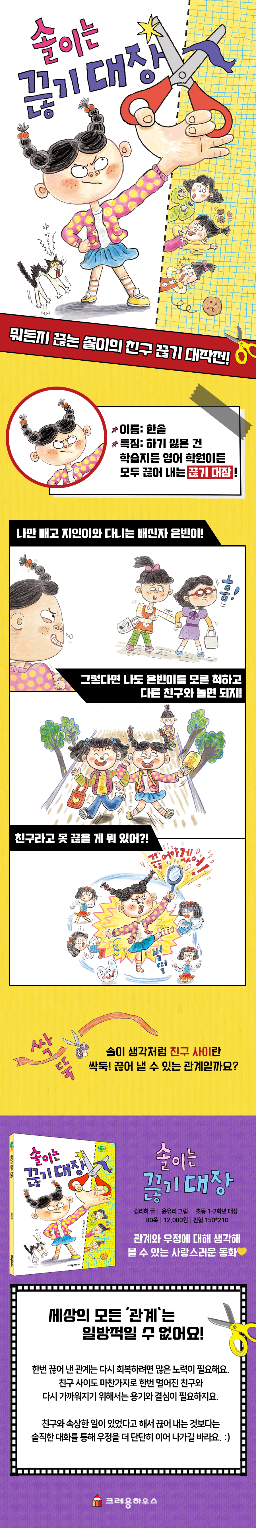 한번 끊어 낸 관계는 다시 회복하려면 많은 노력이 필요해요. 친구 사이도 마찬가지로 한번 멀어진 친구와 다시 가까워지기 위해서는 용기와 결심이 필요하지요. 학습지도 미술 학원도 영어학원도 다 끊어 낸 끊기 대장 솔이도 은빈이를 끊기란 어려웠으니까요. 여러분도 친구와 속상한 일이 있었다고 해서 끊어 내는 것보다는 솔직한 대화를 통해 우정을 더 단단히 이어 나가면 좋겠습니다. 발랄하고 귀여운 일러스트가 글의 재미를 배가시키고 눈을 즐겁게 합니다. 글을 읽으며 자연스레 관계와 우정에 대해서 생각해 볼 수 있는 사랑스러운 동화입니다.