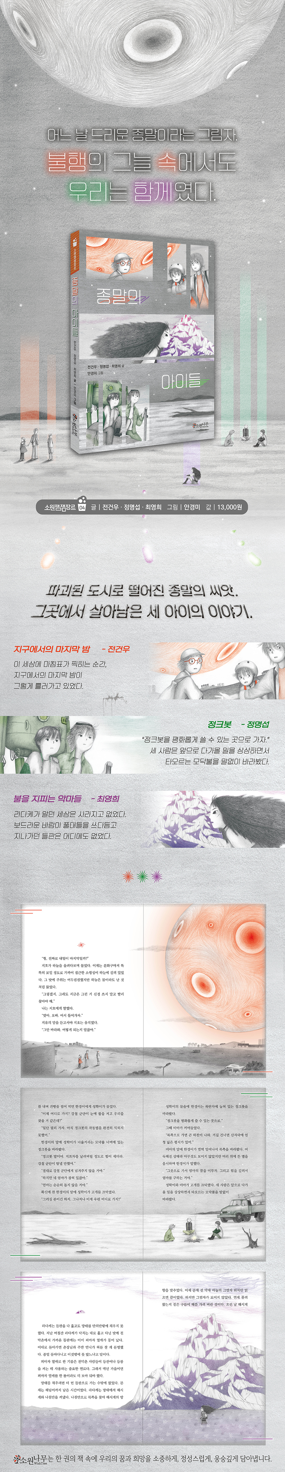 한 치 앞도 보이지 않는 종말의 그늘 속에서 희망의 빛을 이야기하는 《종말의 아이들》. 한국 장르문학을 대표하는 전건우, 정명섭, 최영희 작가가 힘을 모아 그려 냈다. 각각 소행성 충돌, 전염병과 로봇, 변종 곤충의 등장으로 다양한 볼거리를 만들어 올여름 서늘한 공포감을 선사한다. 일반적인 추리 공포물과는 다른 현실적인 모습으로 어린이 독자에게 새로운 장르문학을 선보인다. 또한 안경미 그림 작가의 차가운 무채색의 그림은 이야기를 더욱 몰입하게 만들고, 서늘한 그림 질감과 이야기별 세 가지 색이 더해져 불안한 어둠 속에서도 ‘함께’라는 메시지를 전달한다. 종말이 왔을 때 무력감에 빠지는 것은 당연하다. 하지만 그 대처가 옳은 것은 아니다. 마지막까지 살아남는 것은 두려움이 아닌 ‘함께라는 믿음’과 ‘우리라는 격려’가 아닐까. 《종말의 아이들》 속 세 이야기가 말하는 믿음과 격려를 통해 삶의 소중한 의미를 되새겨 보자.