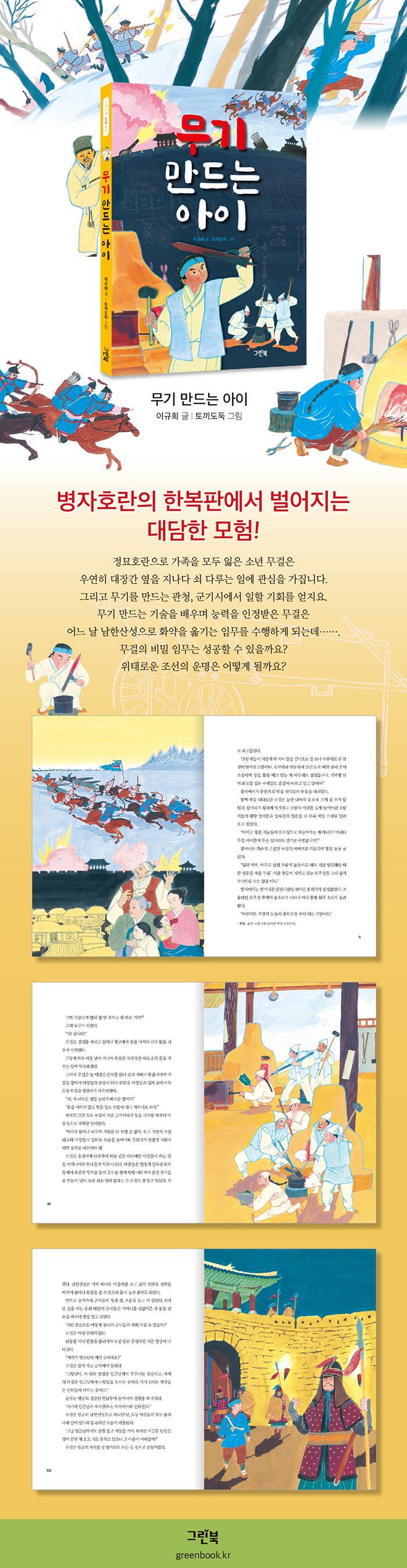 《무기 만드는 아이》는 실제 있었던 병자호란을 배경으로 합니다. 병자호란의 배경이 되었던 정묘호란부터 이야기가 시작되지요. 실제 일어났던 역사적 사건에 어딘가에 있었을지도 모를 사람들의 이야기를 흥미로운 상상력으로 풀어냈습니다. 이는 책을 읽는 아이들이 역사 속 무대 위에서 덩달아 상상력을 발휘할 수 있는 힘이 되어 줄 것입니다. 또한 병자호란이 발발한 과정과 병자호란 때 인조 임금이 세자와 피난을 떠났던 남한산성에 대해서도 자세히 알아봅니다. 책을 읽으며 병자호란이 왜 일어났는지 그 배경을 알아가는 등 역사적 사건에 대한 이해가 높아지고, 그러는 동안 자연스럽게 조선 시대의 방어 체계에 대해서도 접할 수 있을 것입니다.