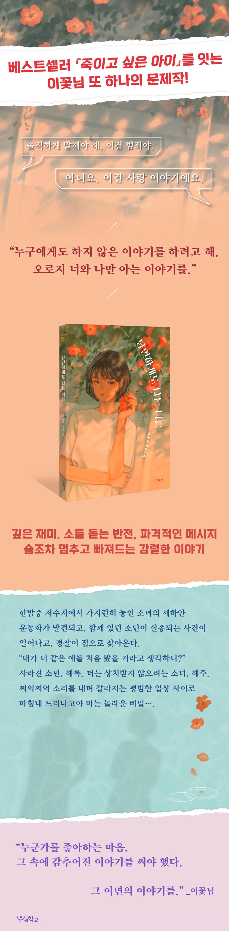 어떤 책도 읽지 않으려 하는 십 대들도 이꽃님 작가의 전작 『죽이고 싶은 아이』는 끝까지 읽었다는 이야기가 학교에서, 도서관에서, 그리고 서점에서 수없이 들려왔다. 책을 내던져버린 청소년들을 다시 책으로 이끄는 이꽃님 작가의 힘. 그 힘은 다름 아닌 이야기 자체의 힘이다.