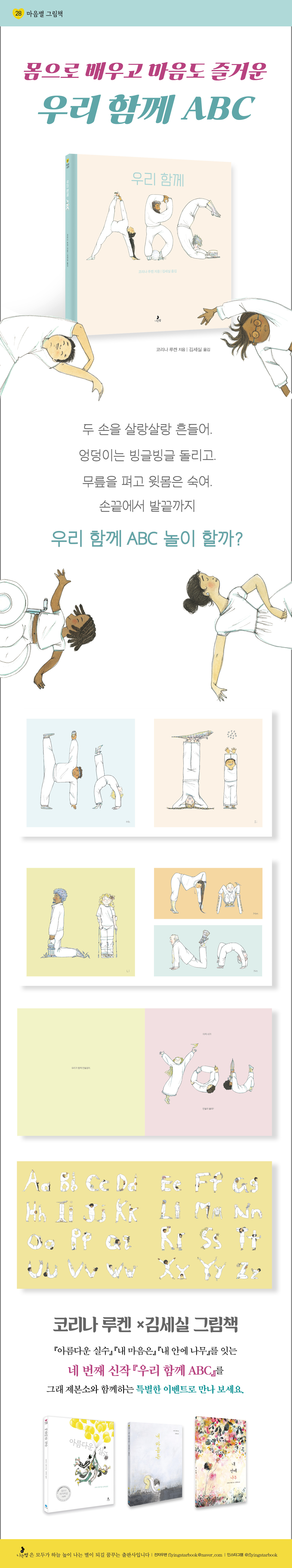 코리나 루켄이 쓰고 그린 네 번째 그림책이 김세실의 번역으로 새로 선보인다. 작가가 지금까지 보여준 전작의 그림책들과는 다른 분위기이다. 부드러운 파스텔톤 색감으로 그려낸 ‘알파벳을 몸’으로 표현한 활동적인 그림책이다. ‘즉흥 무용’을 전공한 루켄이 15년 동안이나 구상해 그린 그림 속에는 아프리카와 카리브해에 전통을 둔 52개의 다양한 몸동작이 연출된다. 보자마자 아이, 어른 할 것 없이 함께 움직이게 되는 ABC 그림책이 등장했다.