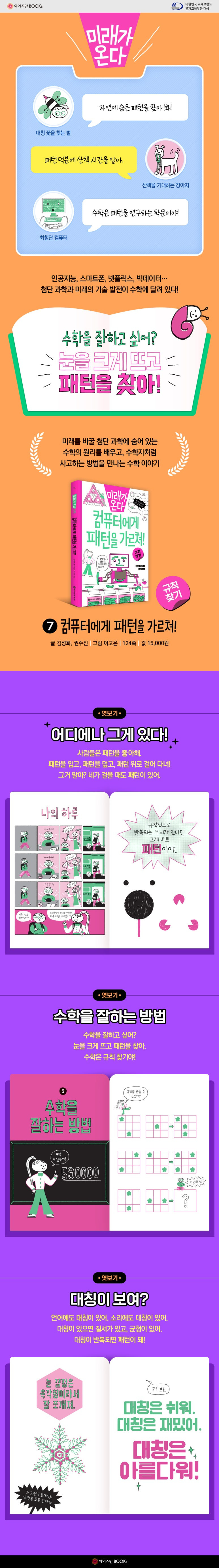 〈미래가 온다_수학〉시리즈는 수학자처럼 바라보는 법을 배우고, 고전 수학부터 현대 수학까지 미래를 바꿀 첨단 과학 문명의 바탕에 숨은 수학을 엿보는 어린이 교양 수학책이다. 아이들은 이미 수학을 잘할 준비가 되어 있다. 시작하는 방법을 알려 준다면! 지금까지의 수학에 대한 생각을 잊고, 마음을 활짝 열고 처음부터 수학을 해 보자. 도대체 수학이란 뭘까? 수와 연산, 소수, 기호와 식, 함수와 그래프, 확률, 도형과 위상 수학, 패턴, 대칭, 데이터, 무한에 이르기까지…… 수학은 간단하고 위대한 아이디어들로 시작되었다. 그리고 수학은 아직 한참 더 진행 중이다. 수학의 세계에는 아직 찾지 못한 정답이 무수히 많고, 아무리 저명한 수학자일지라도 밝혀내지 못한 개념이 수두룩하기 때문이다. 미지의 수학 세계에 우리 아이들이 빛을 밝힐 수 있도록, 이 책은 수학의 세계로 다가가는 여정에 훌륭한 가이드 역할을 해낼 것이다.