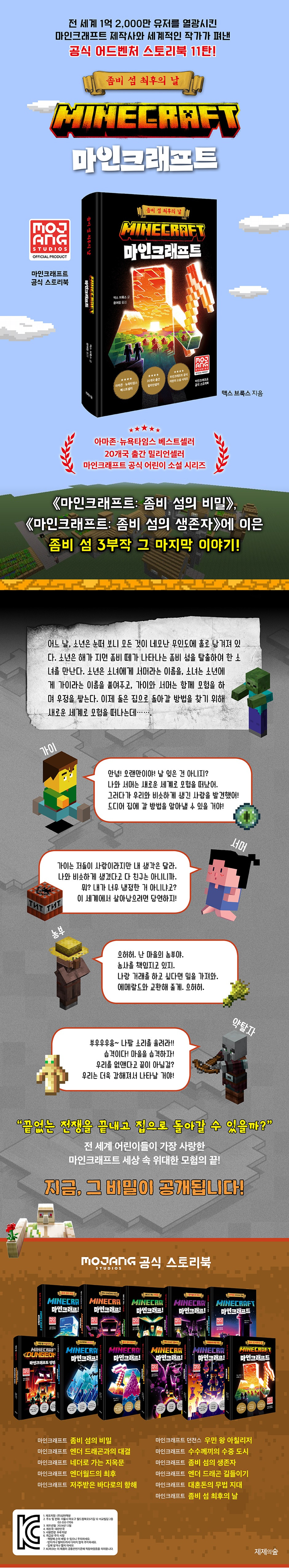 이후 2권 《엔더 드래곤과의 대결》과 3권 《네더로 가는 지옥문》, 4권 《엔더월드의 최후》, 5권 《저주받은 바다로의 항해》, 6권 《마인크래프트 던전스: 우민 왕 아칠리저》, 7권 《수수께끼의 수중 도시》, 8권 《좀비 섬의 생존자》, 9권 《엔더 드래곤 길들이기》, 10권 《대혼돈의 무법 지대》로 이어지는 마인크래프트 시리즈는 전 세계 1억 7500만 부 이상 판매되면서 밀리언셀러로 탄탄하게 자리 잡았다. 그리고 마침내 열한 번째 책 《좀비 섬 최후의 날》을 독자들에게 선보인다.