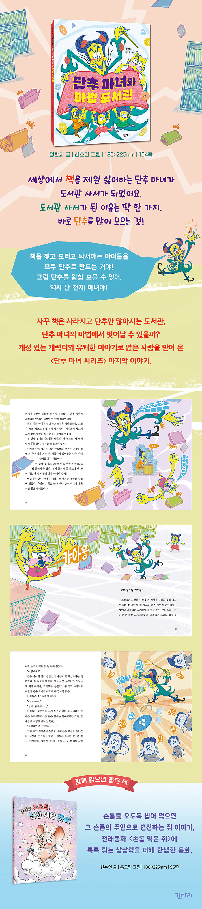 세상에서 책을 제일 싫어하는 단추 마녀가 책을 함부로 다루는 아이들을 모조리 단추로 만들기 위해 도서관 사서가 되었다.