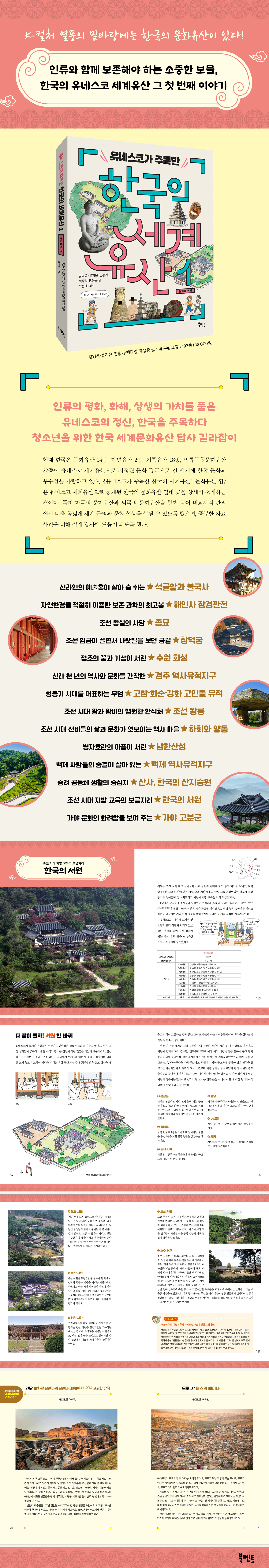 K-팝, K-드라마와 영화, K-문학, K-푸드 등 문화 콘텐츠가 이끈 한류는 최근 더욱 다양한 양상으로 전개되는데, 한국 문화에 관심을 가진 세계인들은 이제 미디어를 통해 접하는 것을 넘어서서 더욱 적극적으로 한국의 문화와 역사를 배우고 직접 체험하고자 한다. 노벨문학상을 받은 한강 작가의 작품 배경이 된 광주나 제주를 직접 방문해 역사를 공부하거나 사극의 배경이 된 유적지를 찾아 역사와 문화를 체험하는 여행이 큰 인기를 끌고 있는 것이다. 유산은 앞 세대가 세대에 물려주는 물질적이고 정신적인 가치를 이르지만, 최근 한국 문화의 인기와 열풍을 살펴보면 문화유산은 그저 과거의 흔적만이 아니라 현재적 가치로 적극 재해석되어 이를 활용해 다양한 문화적 콘텐츠로 재탄생해 미래적인 가치로 나아간다. 《유네스코가 주목한 한국의 세계유산1 문화유산 편》은 한국의 세계유산에 담긴 이러한 미래의 가치에 주목하는 책이다. 이 책을 통해 청소년들이 우리 문화유산을 더욱 아끼고 사랑하며, 인류가 만들어 낸 세계유산을 지키고 보존하는 세계시민으로 성장할 수 있기를 기대한다.