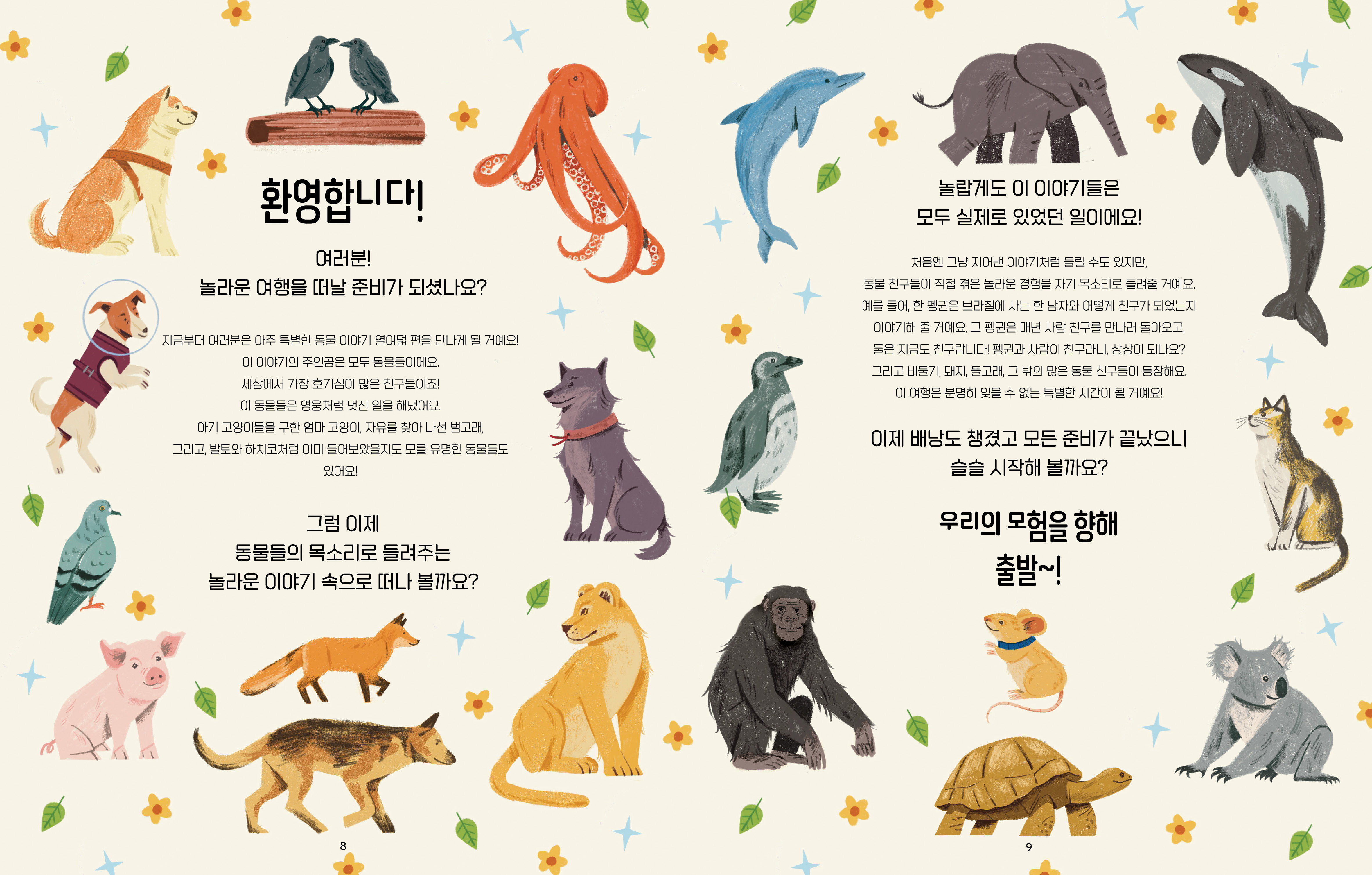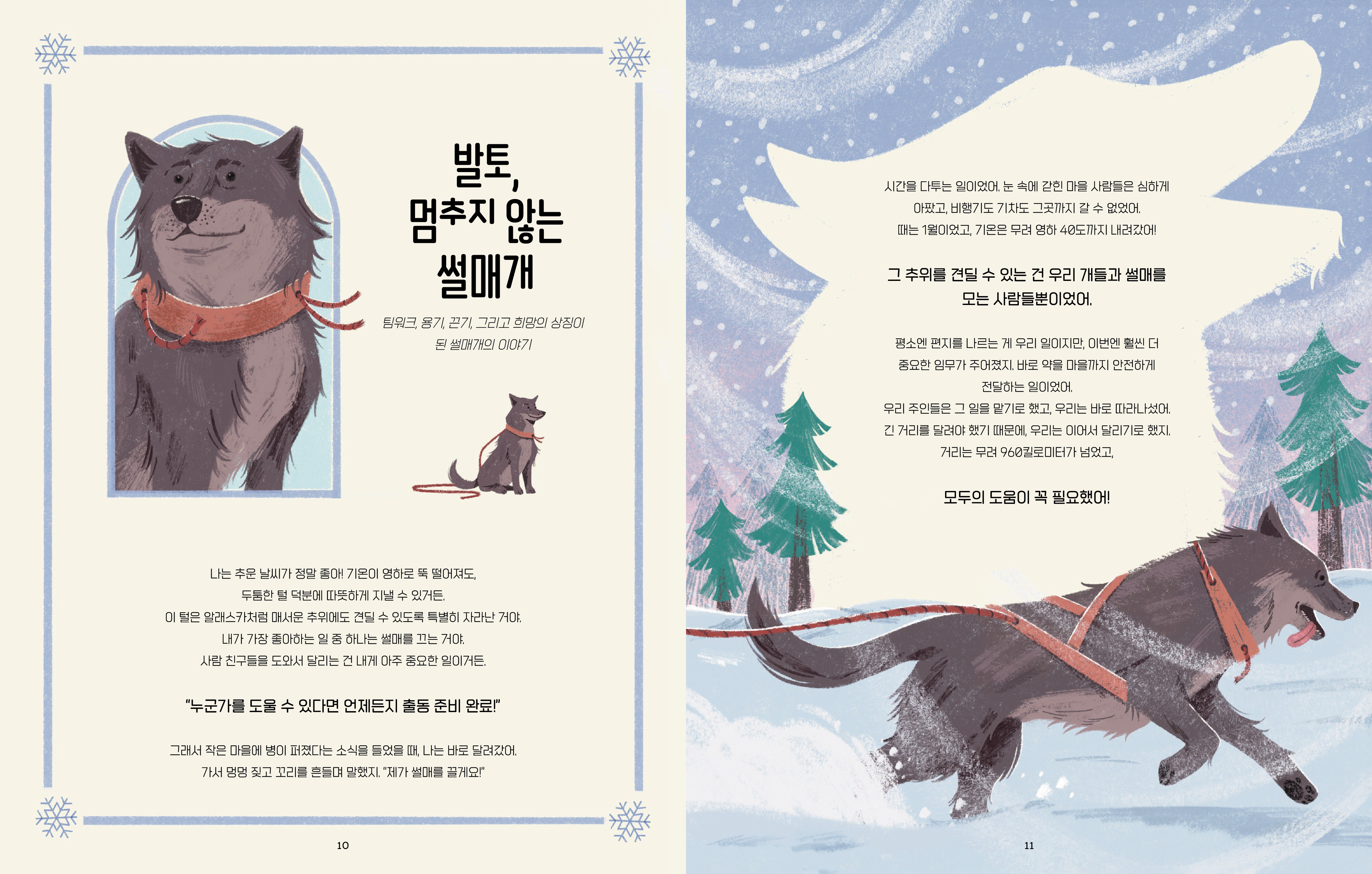 《용감한 동물 친구들 이야기》는 전 세계에서 실제로 일어났던 놀라운 사건들을 바탕으로, 용기와 사랑, 희생과 자유의 가치를 전하는 감동적인 논픽션 스토리북입니다. 위기에 빠진 마을 사람들을 구한 썰매개, 자신을 구해준 은인을 매년 찾아오는 펭귄, 전쟁 속에서 수많은 생명을 구한 전령 비둘기, 새끼를 구하기 위해 불길 속으로 뛰어든 어미 고양이 까지! 이 책에는 인간 못지않은, 때로는 그 이상으로 빛나는 동물 영웅들의 이야기가 담겨 있습니다.