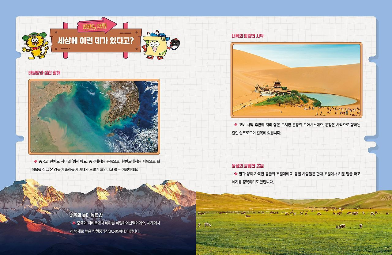이외에도 수많은 질문에 대한 놀라운 답들을 찾을 수 있어요. 중국과 우리나라 사이의 바다를 왜 ‘황해’라고 부르는지, 동부 아시아가 유럽 대륙보다 큰 게 사실인지, 서남아시아나 아프리카에서 볼 수 있는 사막이 정말 동부 아시아에도 있는지 등등 아는 척하기 좋은 정보들이 속속 눈에 들어오게 되지요.