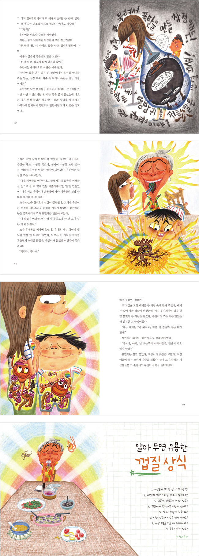 더불어 이 책의 부록에는, 장 건강을 지키기 위해 어린이들이 필수로 알아야 할 유용한 정보가 가득 실려 있습니다. 미생물이 없으면 사람이 왜 살 수 없는지, 유산균의 먹이가 어떤 음식에 더 많은지, 껍질은 왜 먹어야 하는지, 껍질을 깨끗이 씻는 방법, 껍질을 어떻게 활용하면 좋은지, 먹지 말아야 할 껍질과 씨앗은 무엇인지, 야생 식물은 왜 함부로 먹으면 안 되는지, 똥 은행의 탄생 등등 동화와 연계된 여러 정보들을 하나로 모아 한눈에 볼 수 있도록 깔끔하게 정리해 놓았습니다. 결론적으로 자라나는 어린이들이 이 책을 통해 올바른 식습관 개선과 장 건강의 중요성, 미생물이란 무엇이고 우리 몸속에서 어떤 역할을 하는지 알기 쉽게 배울 수 있을 것입니다.