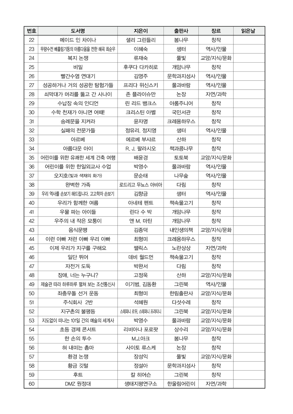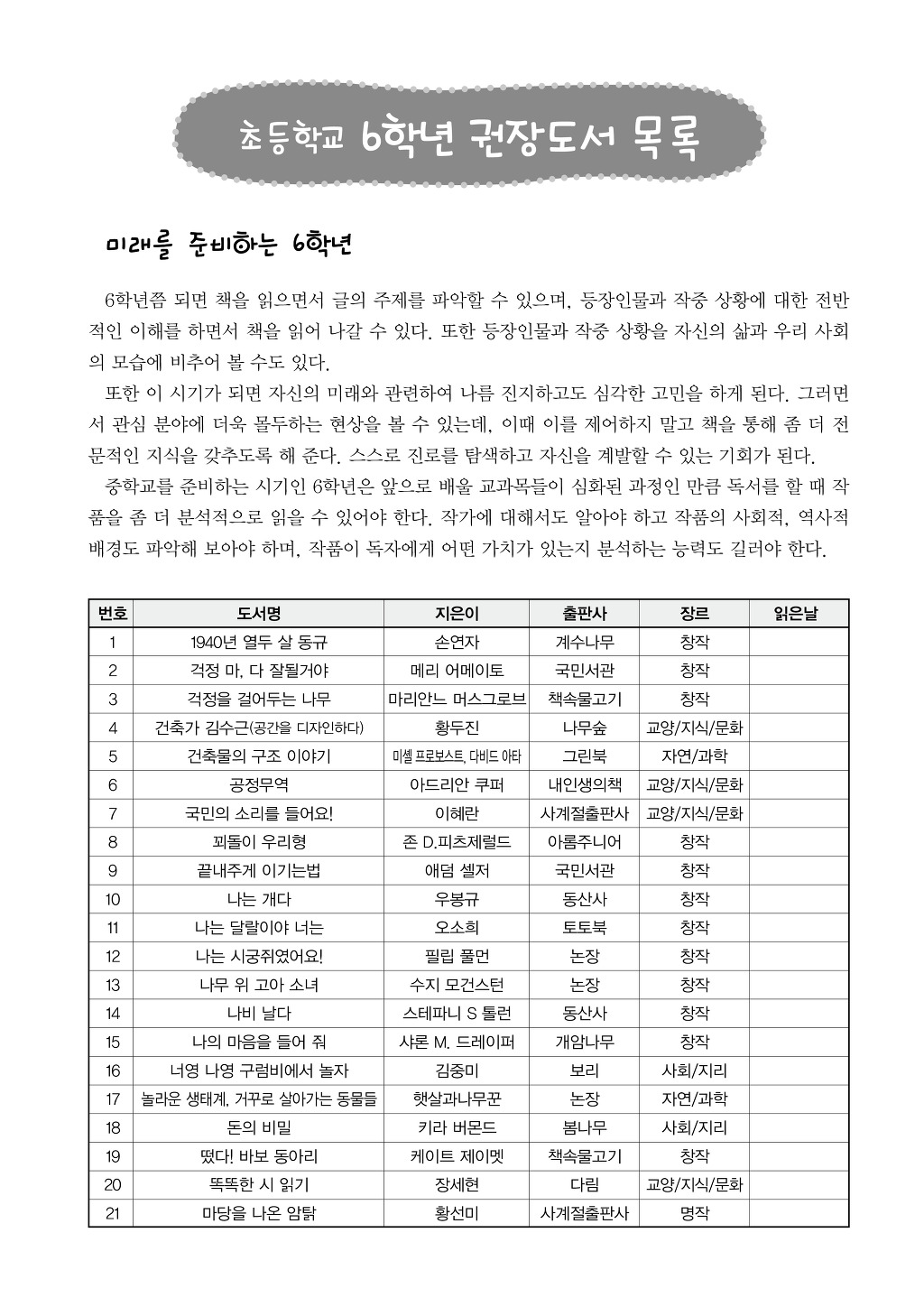(2013년~2014년) 초등학교 6학년 권장도서 목록 - 60종 작성자논장막내(신성종)|작성시간13.11.21|조회수1,843 목록 댓글 11 글자크기 작게가 글자크기 크게가 초등학교 6학년 권장도서 목록입니다. 누구나 자유롭게 엑셀 양식을 사용 할 수 있습니다. 초등학교권장도서목록-6학년.xls 첨부파일첨부된 파일이 3개 있습니다. jpg 파일 360선독서공책(내지)6학년-1.jpg 다운로드 jpg 파일 360선독서공책(내지)6학년-2.jpg 다운로드 xls 파일 초등학교권장도서목록-6학년.xls 다운로드 다음검색 현재 게시글 추가 기능 열기 북마크 공유하기 신고 센터로 신고 댓글 댓글 11 댓글쓰기 답글쓰기 댓글 리스트 작성자파랑새 | 작성시간 14.02.03 좋은 자료 감사합니다 작성자다섯수레(이상연) | 작성시간 14.03.26 저희 도서 제목이 잘못되었네요. <주식회사 6학년 2반>인데 흑 답댓글 작성자논장막내(신성종) 작성자 본인 여부 작성자 | 작성시간 14.03.26 파일은 수정했구요... 이미지도 곧 수정할 예정입니다. 작성자예은맘 | 작성시간 14.06.27 잘 활용하고 있습니다. 감사합니다^^ 작성자이재동 | 작성시간 15.01.21 고맙습니다. 잘 활용하겠습니다. 댓글 전체보기