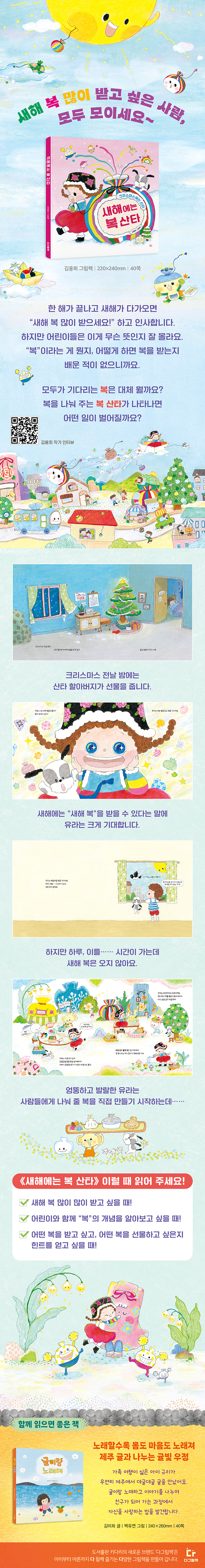 《새해에는 복 산타》는 어린이와 함께 “새해에 받는 복”에 대해 자연스럽게 이야기 나눌 수 있는 창작 그림책입니다. 이 책에는 《구름 방귀 뿡뿡뿡》, 《오싹오싹 키즈 카페》 등에서 기발한 상상력으로 독자들의 사랑을 받아 온 김용희 작가의 실제 경험이 담겨 있습니다.
