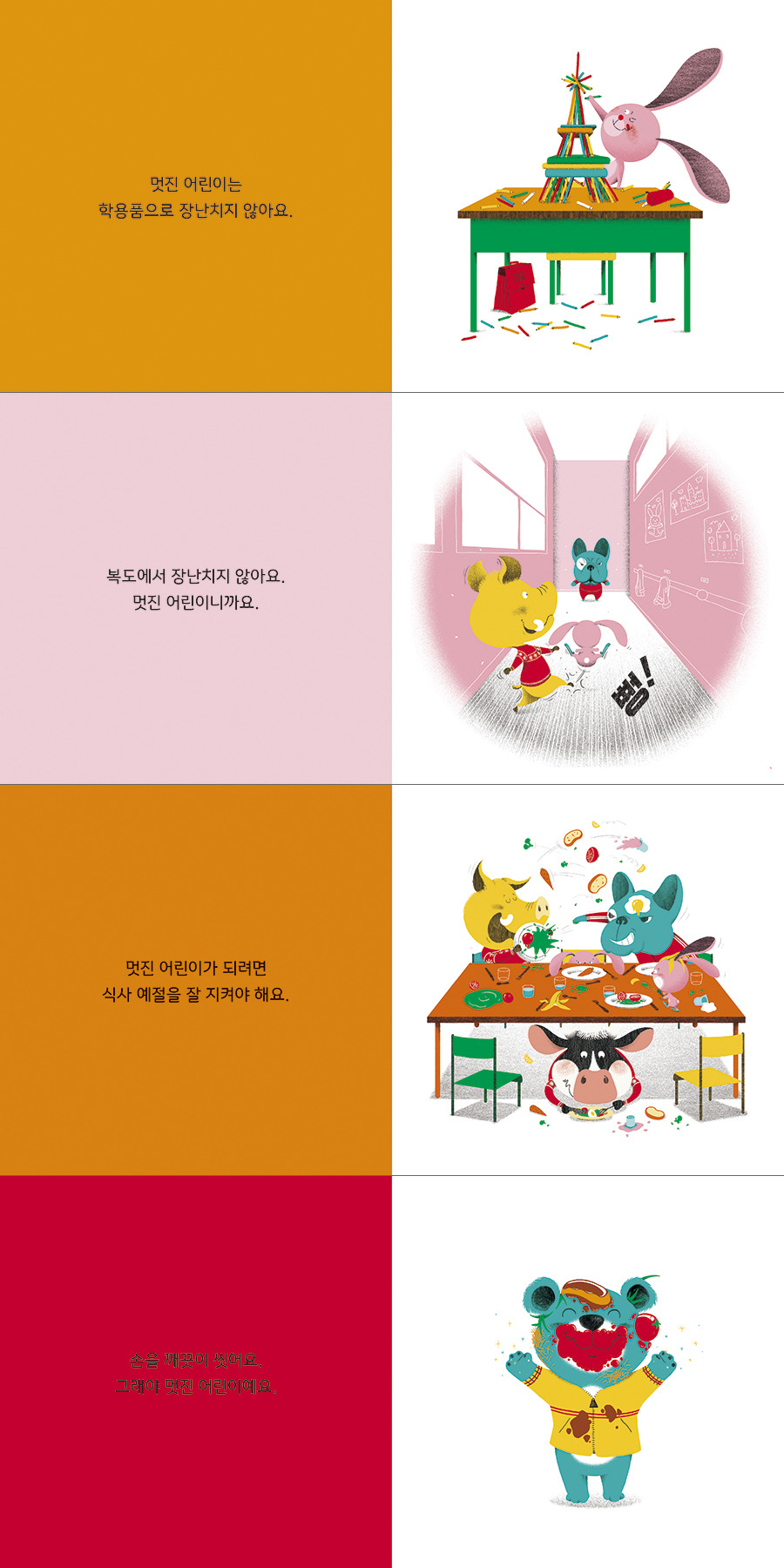 복도 계단에서 앞만 보고 달리는 돼지, 옷과 책을 망가뜨리는 토끼, 신나게 음식을 던지는 불도그와 멧돼지는 재미있는 모습으로 웃음을 불러일으키지만, 조금만 자세히 들여다보면 바로 옆에서 상처받는 동물 친구들을 발견할 수 있습니다. 이 책에는 친구 답을 베껴 쓰는 목이 긴 기린도, 친구를 놀리는 낙서를 하는 토끼도, 얼굴과 옷은 케첩범벅인데 손만 깨끗이 씻고는 만족스러워하는 곰도 있습니다. 사실 이 모든 동물들의 행동은 우리 아이들의 일상 속 모습이기도 합니다. 때문에 《규칙이 필요해!》는 아이들이 동물들의 각 상황에 스스로를 투영해 보고, 자신의 행동이 상대에게 어떤 영향을 미칠지 헤아리고 또 생각할 시간을 갖도록 이끕니다. ‘나’ 중심에서 벗어난 ‘너’와 ‘우리’ 중심의 사고를 통해 왜 규칙이 필요하고 또 이런 규칙들을 지켜야 하는지 깨닫고 또 실천하도록 돕는 것입니다.