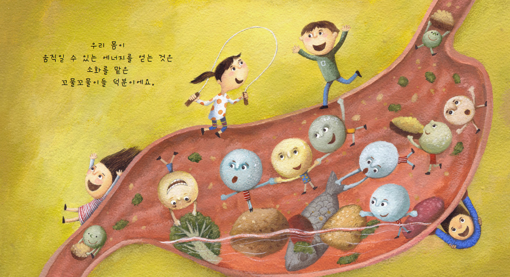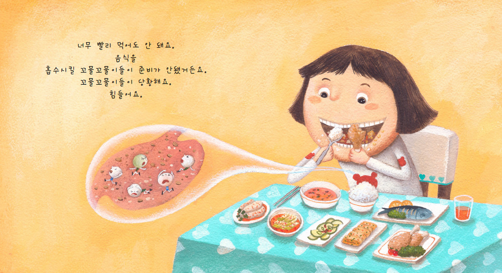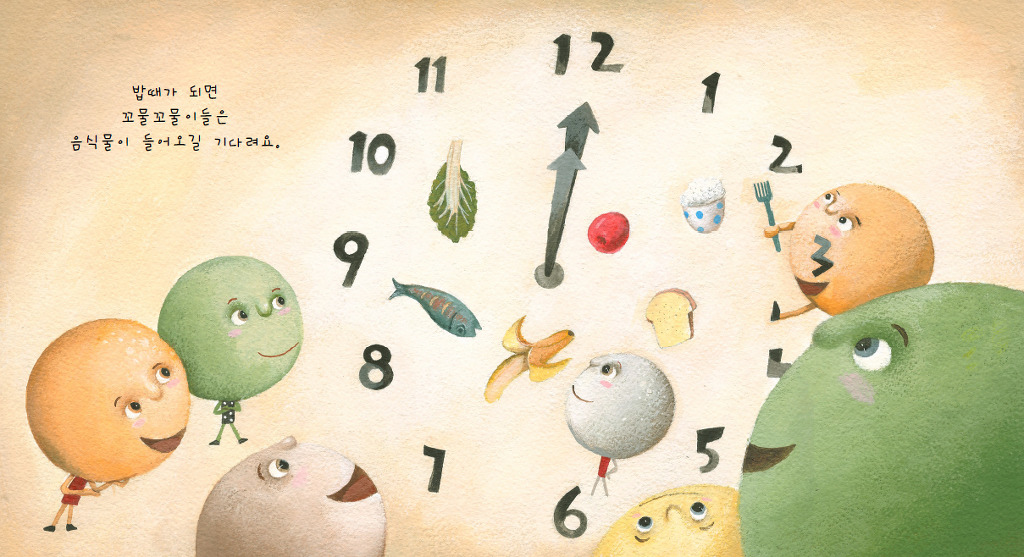정해진 식사 시간에 음식을 꼭꼭 씹어 먹으면 꼬물꼬물이(세포)들은 우리가 병에 걸리지 않고, 잘 자고, 잘 뛰어놀 수 있도록 영양분을 우리 몸에 보내주는 일을 해요. 먹고 싶지 않다고 식사 시간을 지키지 않으면 우리 몸에 필요한 영양소가 부족해 건강한 몸을 만들 수 없게 됩니다. 부모와 그림책을 즐겁게 읽는 사이, 밥 먹는 시간을 왜 지켜야 하는지에 대한 답을 줄 것입니다.