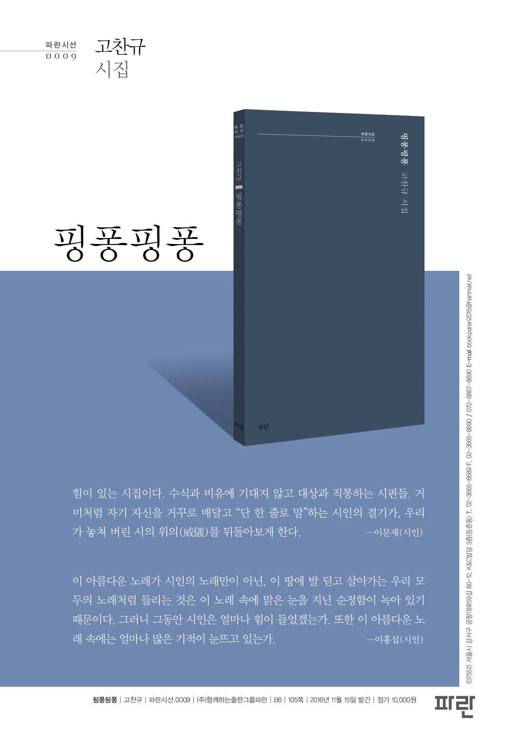 고찬규 시인의 두 번째 신작 시집 <핑퐁핑퐁>이 2016년 11월 15일, ‘(주)함께하는출판그룹파란’에서 발간되었다. 고찬규 시인은 1969년 전라북도 부안에서 출생하였으며, 경희대학교 국어국문학과를 졸업하고, 동 대학원에서 석사 과정을 수료했다. 1998년 <문학사상>을 통해 등단하였으며, 시집으로 <숲을 떠메고 간 새들의 푸른 어깨>가 있다.