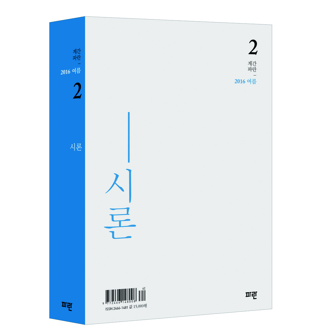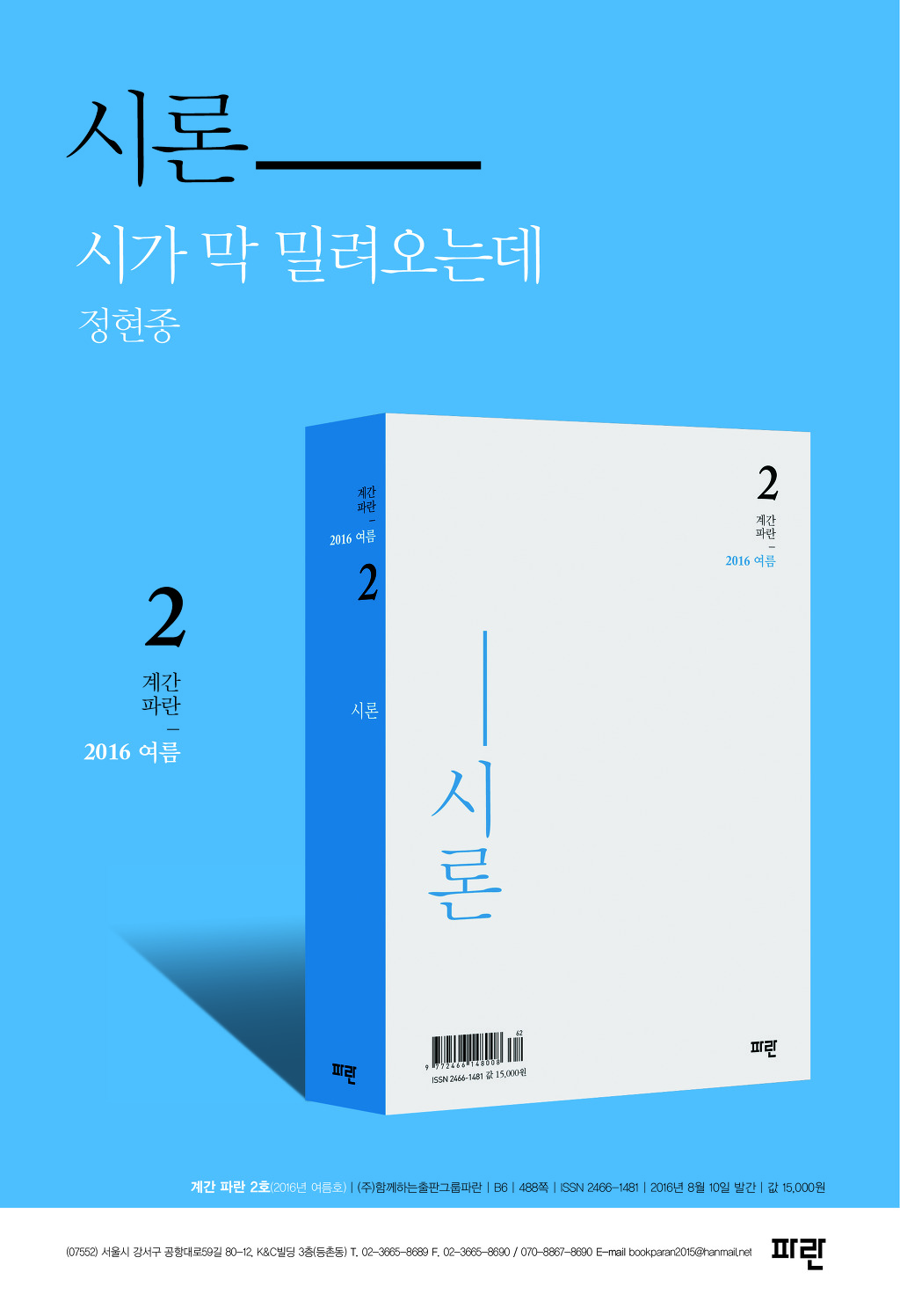 <계간 파란> 2호(2016년 여름호)가 2016년 8월 10일, ‘(주)함께하는출판그룹파란’에서 발간되었다. <계간 파란> 2호의 이슈(issue)는 독자들께 약속드린 바와 같이 ‘시론’이다. 허만하, 정현종, 문정희, 이하석, 원구식, 백무산, 송재학, 허수경, 오정국, 나희덕, 박용하, 이원, 함기석, 이수명, 김참, 정재학, 김언, 이재훈, 이영주, 이준규, 신동옥, 신영배, 이현승, 장석원, 이근화, 정한아, 이제니, 정영효 등 현재 한국 시단에서 활발하게 작품 활동을 펼치고 있는 원로와 중진, 신진 시인 28명의 시론이 실려 있다. 지금도 여전히 여러 문학 관련 잡지들에서 다양한 코너들을 통해 시인들의 시론을 꾸준히 소개하고 있지만, 시에 대한 새로운 담론을 불러일으키거나 현 시단의 여러 의제들을 논의할 때, 심지어는 해당 시인의 시를 읽을 때조차 시론에 눈길을 두지 않는 경우가 대부분이다. 더구나 근래 들어서는 ‘시론’이라는 이름에 값하는 글을 마주하는 일마저 드물다. 이런 현상은 별도의 자리를 마련해 논의해 봐야 할 만큼 중요한 사안일 것이다. 이에 <계간 파란>에서는 그 첫 번째 작업으로 시인들의 시론을 한자리에 모아 그 현재와 미래를 가늠하고 도모하고자 한다. 원론적인 이야기이지만, 시론은 시인 자신과, 그의 실제 작품과, 시 일반에 대한 반성적 기획이자 기투다. 이번 <계간 파란> 2호에 실린 28편의 시론들이 앞으로 한국 시단에 진지한 자기반성과 시에 대한 새로운 가능성들을 예고하는 밑거름이 되길 바란다.