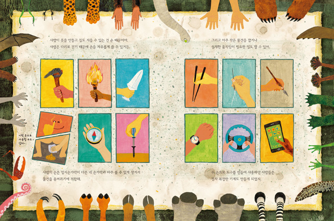 사람이 뭐예요?는 동물들의 시선을 통해 사람의 신체와 생활 모습, 여러 가지 특징 등을 살펴볼 수 있는 지식그림책입니다. 엄마 아빠 손을 잡고 동물원에 처음 가 본 아이들은 침팬지 팔이 저렇게나 길었어?”하며 동물들의 실제 모습에 감탄하곤 하죠. 그런데 사람들이 침팬지를 신기하게 바라보는 그 순간, 침팬지도 이런 사람들을 마주 보며 관찰하고 있을지도 모릅니다. “사람들은 나랑 꽤나 비슷하게 생겼네? 나처럼 걸어 다니기도 하잖아.” 하면서 말이죠.