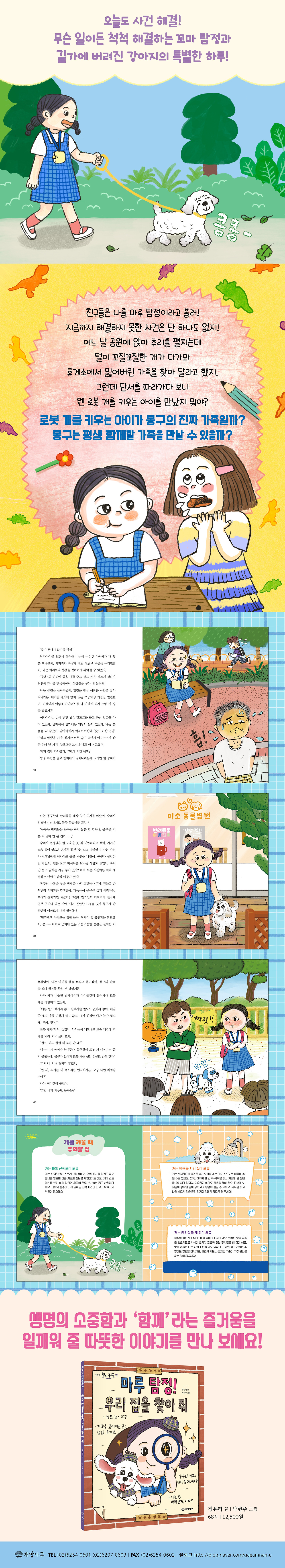 《마루 탐정! 우리 집을 찾아 줘》는 어려운 사건도 똑 부러지게 해결하는 마루 탐정과 가족을 찾는 강아지 몽구의 특별한 하루를 그린 동화입니다. 길가에 버려진 강아지 몽구와 몽구의 가족을 찾아 나선 마루가 들려주는 이야기를 통해 생명의 소중함과 ‘함께’라는 즐거움을 전합니다.