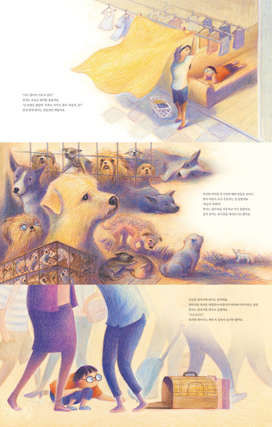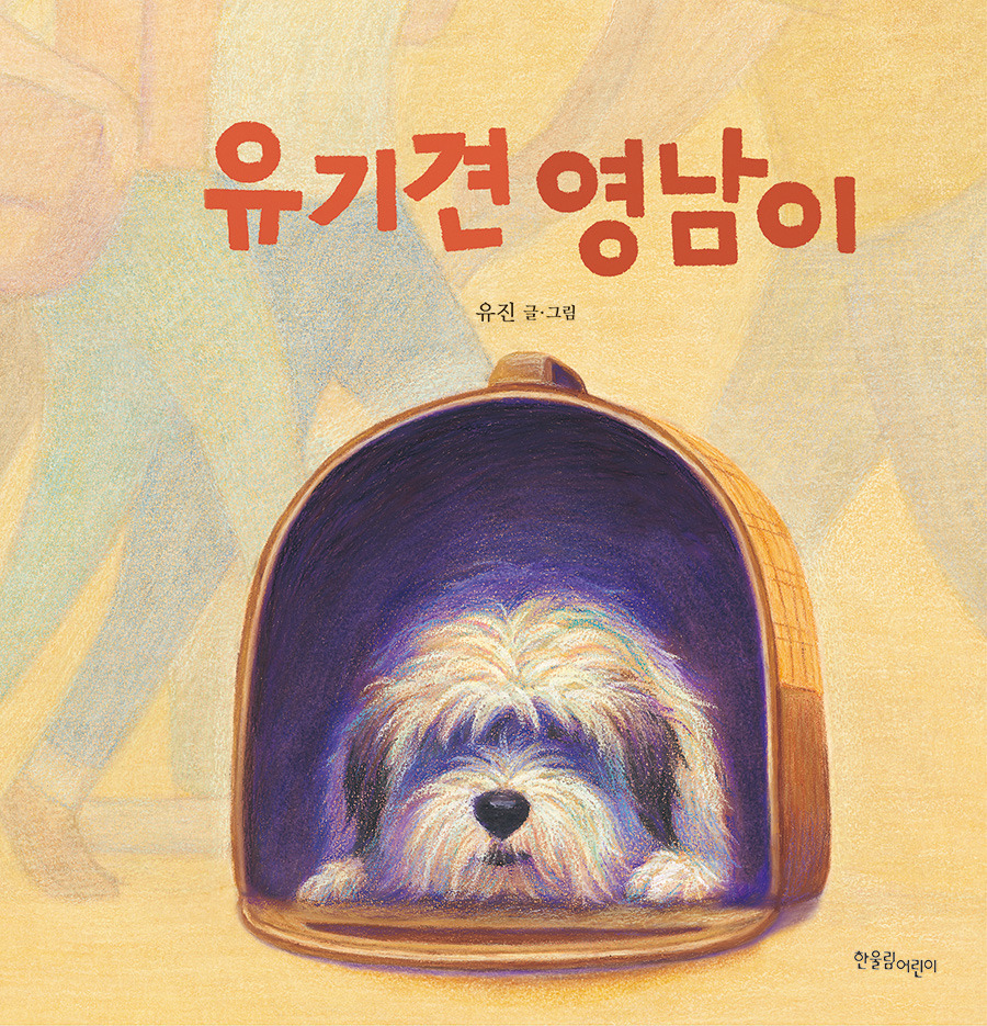 《유기견 영남이》는 표지부터 시선을 사로잡습니다. 많은 사람들이 돌아다니는 길가에서 휴대용 케이지에 담겨 있는 영남이는 잔뜩 풀죽은 모습입니다. 상처와 슬픔으로 가득한 눈은 북슬북슬한 털에 가려져 있지요. 저자는 오일파스텔을 주 재료로, 노란색과 푸른빛이 도는 보라색을 사용해 영남이를 식구로 맞아들이는 민지 가족의 따뜻한 마음과 유기견 영남이의 불안한 심리를 효과적으로 표현해 냈습니다.