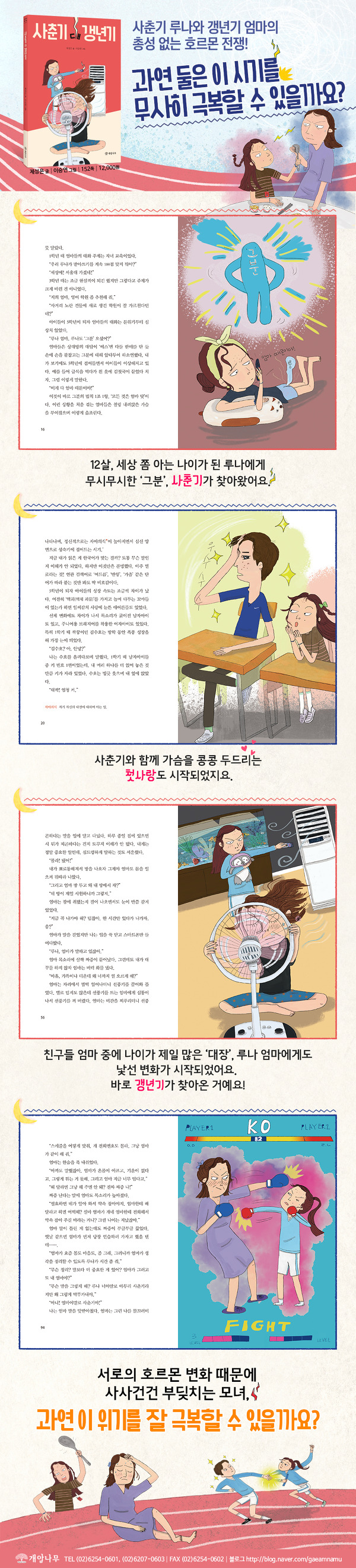 주인공 루나는 늦잠을 잔 것도, 아끼던 옷에 케첩이 튄 것도, 이어달리기 연습에서 계속 지는 것도 모두 엄마 탓으로 돌립니다. 또 엄마와의 대화보다 친구들과 시간 보내는 것이 좋고, 친구들에게 일어나는 신체적 변화에 호기심을 갖지요. 이는 흔한 사춘기 증상입니다. 이처럼 ≪사춘기 대 갱년기≫는 짝사랑이 되어 버린 첫사랑, 예상치 못하게 맞닥뜨린 진짜 첫사랑, 초경 파티 등 현실감 넘치는 사건들로 가득합니다. 또한 주인공의 심리를 디테일하게 표현하여 사춘기를 겪는 아이들도, 그런 아이들을 바라보는 부모님도 모두 고개를 끄덕이며 흥미롭게 읽을 수 있습니다.