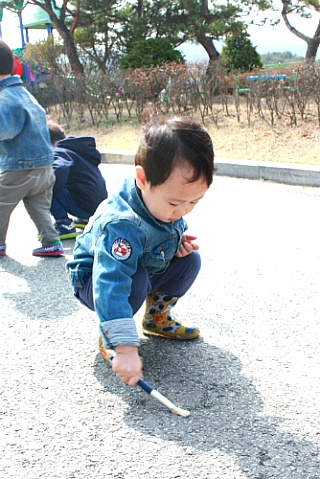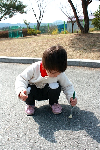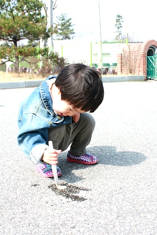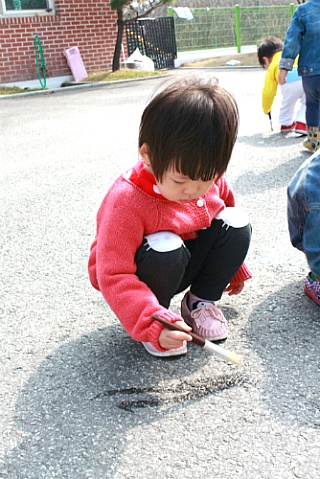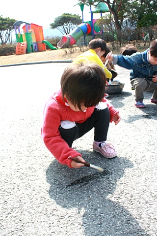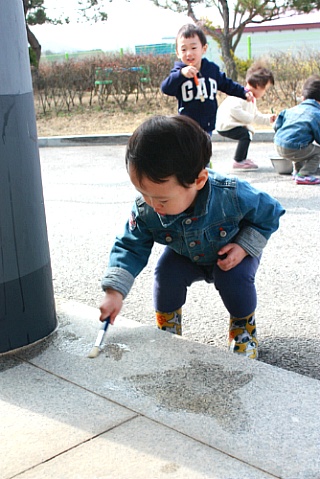 물통에 있는 물에 붓을 콕콕 찍어 그림을 그린답니다^^
