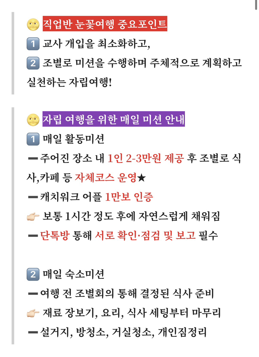 작성자김민주 작성시간 26.01.07 직업반에 들어와서 언니오빠들, 친구들과 첫 눈꽃여행을 와있는데 제가 상상했던 것보다 훨씬 더 새롭고, 활동량도 있어서 저에게 딱 맞아서 너무 좋았습니다🙈 그래서 앞으로의 눈꽃여행 기간까지 적극적으로 팀원들과 재밌게 다니겠습니다❣️☺️👍 그리고 더 깊게 깨닳은 부분은 제가 집에 있을때는 부모님께서 다 해주셨는데 여기 눈꽃여행에서는 저희가 모든것을 직접 해야 하는 부분들을 직접 해보니 쉬운 일은 아니였던 것 같습니다🤭하지만 언젠가는 저의 힘으로 독립을 해야하기에 학교에서 이렇게 독립적인 생활을 여행과 이어서 프로젝트를 만든 부분이 너무나도 뜻깊은 시간인것같습니다❤️