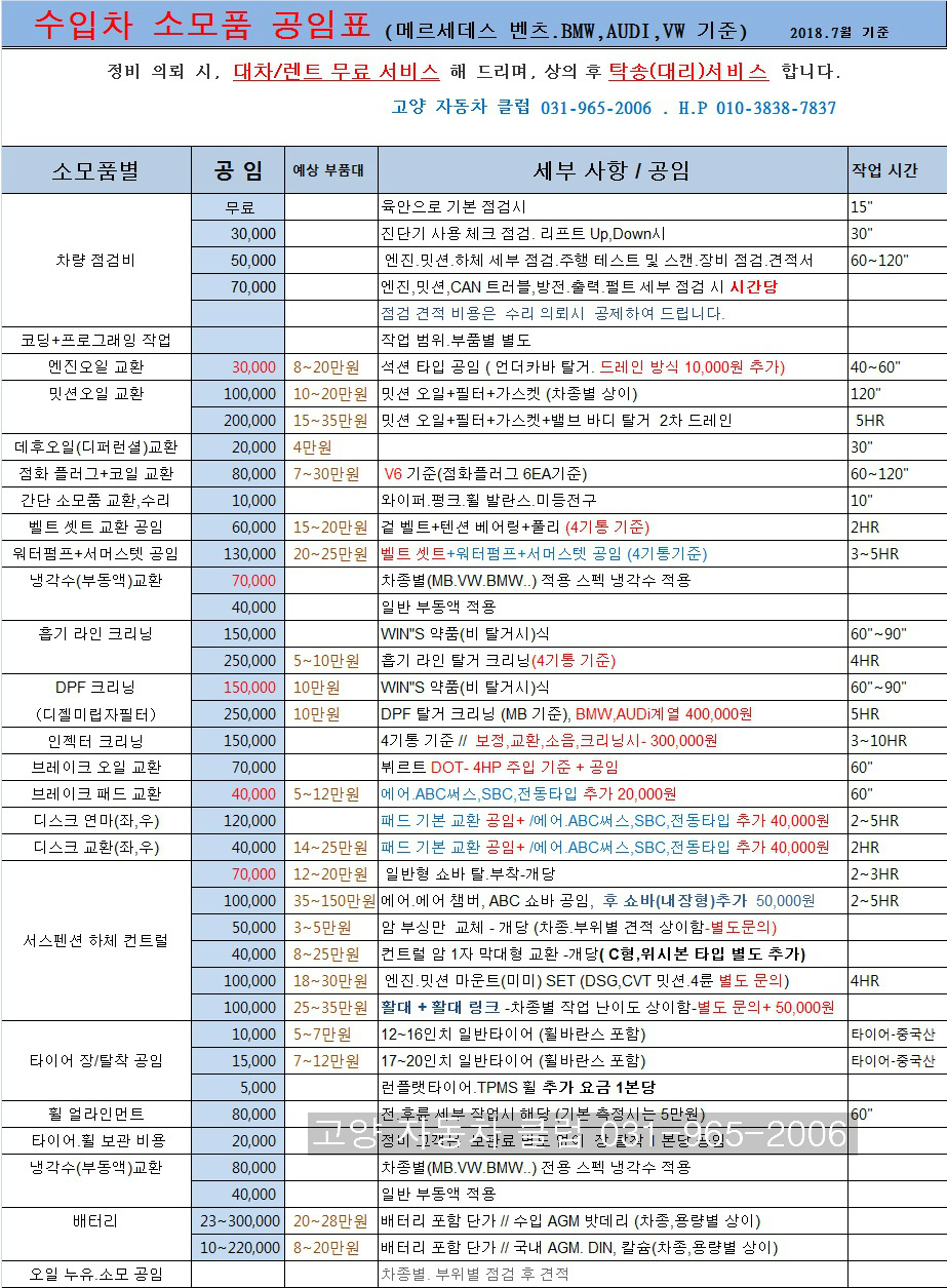 참고용 정비 공임표