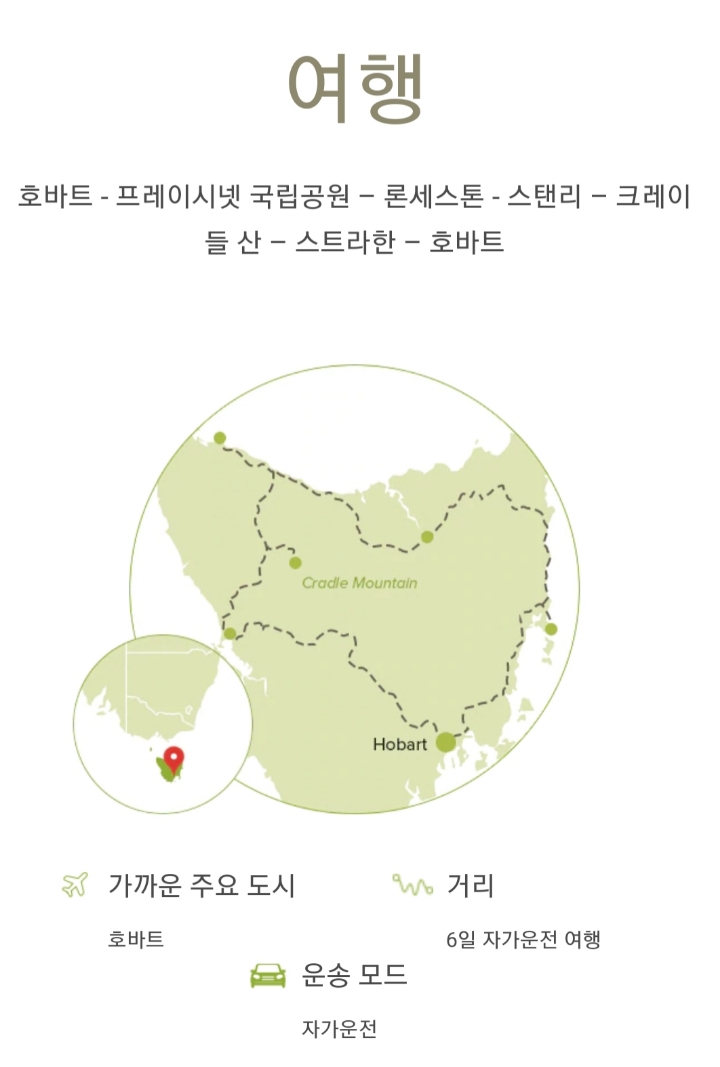 호바트 - 프레이시넷 국립공원 - 론세스톤 - 스탠리 - 크레이들 산 - 스트라한 - 호바트