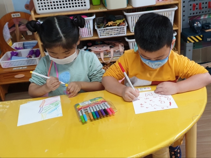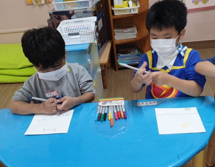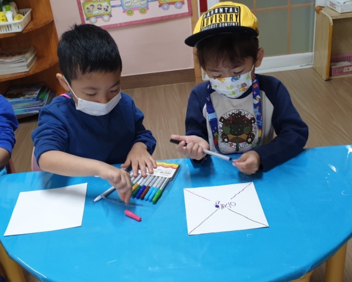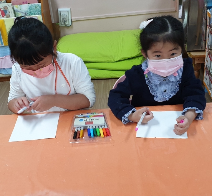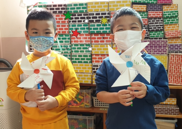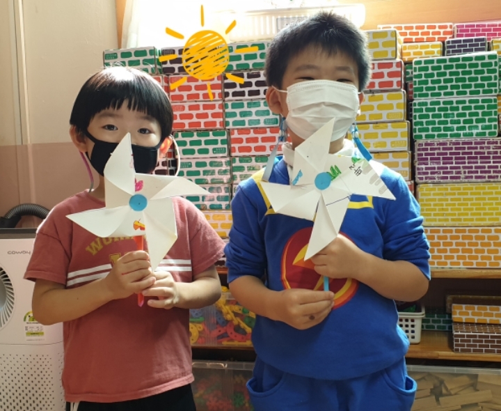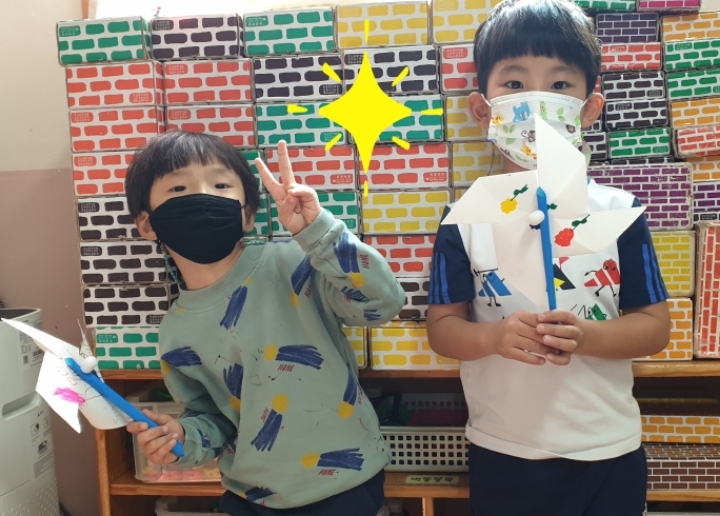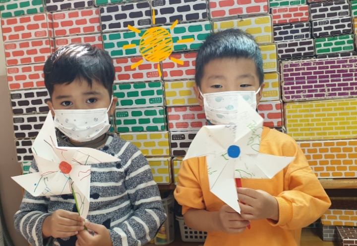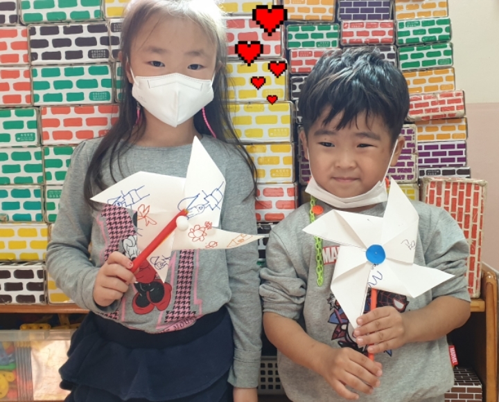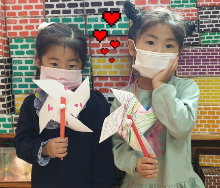 지난주에 고운둥이들과 바람개비를 만들었어요 하얀도화지에 싸인펜으로 자유롭게 그림을 그리고 사선으로 선을 그려주고 고운둥이들 가위로 선따라 오리고 가운데로 모아 붙이니 바람개비가 되었어요 실외놀이 시간에 내가 만든 바람개비를 돌리니 가을바람에 바람개비가 빙글빙글 잘 돌아갔어요~^^♡