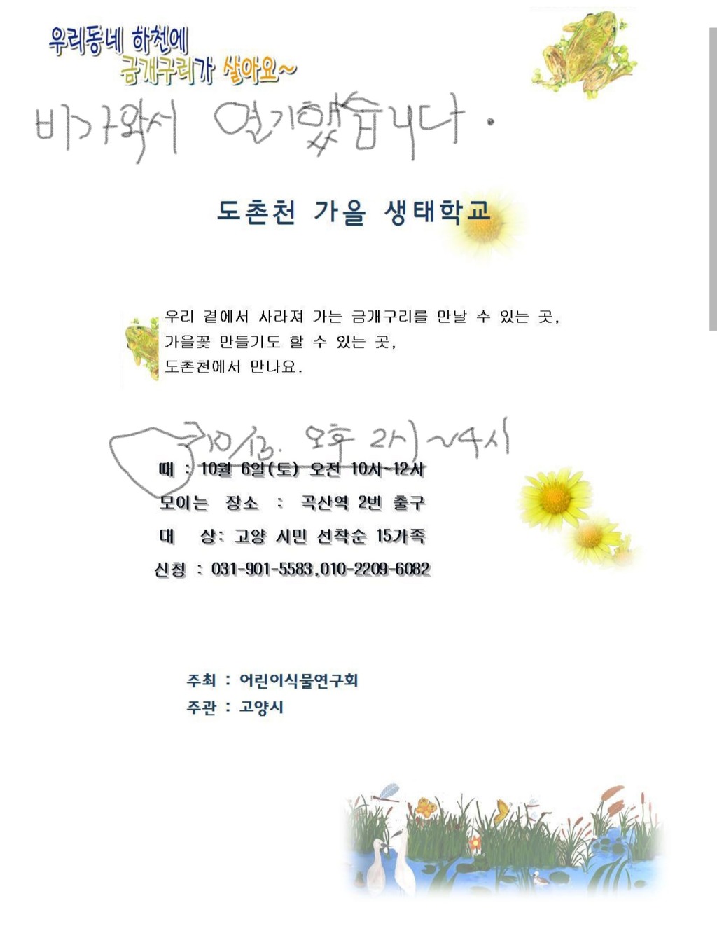 <추가모집>10월13일 도촌천 생태학교 작성자김미혜|작성시간18.10.05|조회수214 목록 댓글 0 글자크기 작게가 글자크기 크게가 10월 13일로 연기된 도촌천 생태학교에 두가족 더 신청을 받습니다. 다음검색 현재 게시글 추가 기능 열기 북마크 공유하기 신고 센터로 신고 댓글 댓글 0 댓글쓰기 답글쓰기 댓글 리스트