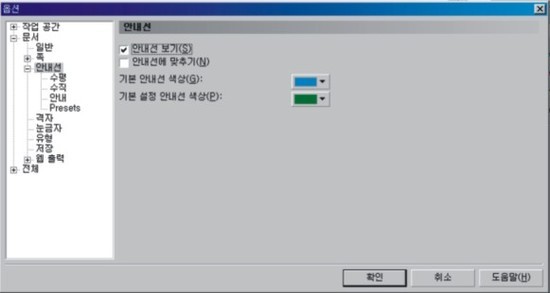 안내선의 색상, 안내선 보기 명령, 안내선에 맞추기 명령 또한 이곳에서 선택가능합니다.