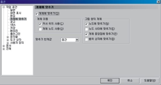 개체에 맞추기 설정과 관련된 옵션창을 보여주고 사용자의 취향에 따라 조절을 하는 부분입니다.