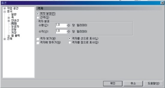 격자 보기 명령, 격자에 맞추기 명령, 격자를 점 또는 선으로 표시할지의 여부도 선택가능합니다.