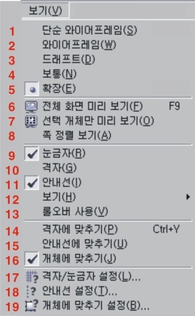 15. 격자에 맞추기, 16. 안내선에 맞추기, 17. 개체에 맞추기