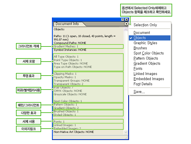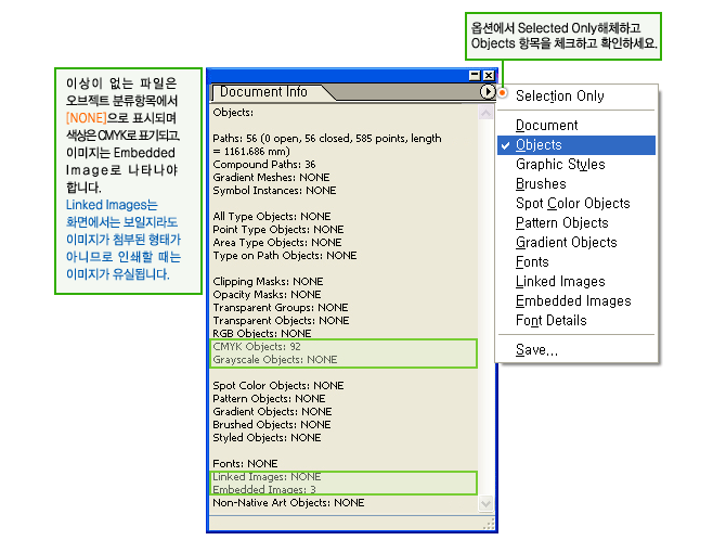 문서정보를 열어서 ( File - Document info)Document info의 option버튼을 클릭 selection only의 체크하고 object를 체크합니다. 정상적인 파일이라면 문서정보에서 옆의 붉은 상자 안의 값들은 모두 NONE값이어야 합니다. (Compound paths, Compound Shapes의 경우 필히 확인 바랍니다. NONE값이 아닌 파일로 인쇄시 효과/색상/서체변경 등 인쇄 불량이 생길 수 있으므로 꼭 작업한 디자인 개체를 확인해주세요.