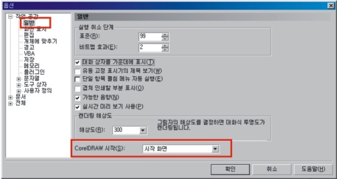 앞에서 설명한 항목을 선택전 이 체크항목을 해제하면 이후에 코렐드로우 실행시