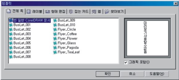 위 항목을 선택하면 아래 그림과 같이 Corel에 설정되어있는 레이아웃 항목이 보여지며,