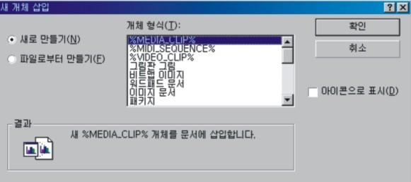 아래그림과 같이 선택옵션창이 생성되며 원하는 프로그램의 문서를 선택하면 해당 프로그램과 연결된 OLE개체를