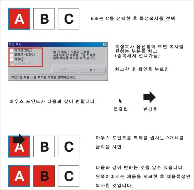 특성복사는 일반 복사와 같이 복사한 개체를 생성하는것이 아니라 기본이 되는 A라는 개체의 특성