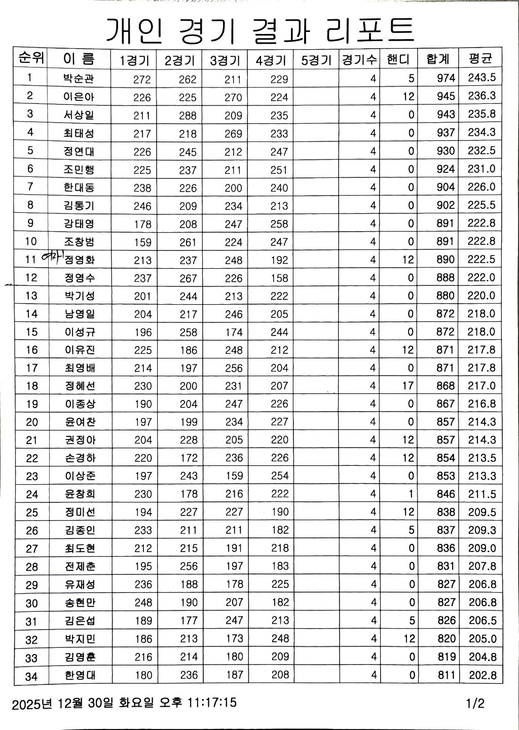 12월 챔프 결과 작성자안산제일볼링센터짱|작성시간25.12.31|조회수767 목록 댓글 1 글자크기 작게가 글자크기 크게가 1위 박순관 2위 이은아 3위 서상일 4위 최태성 5위 정연대 여자 1위 정영화 다음검색 현재 게시글 추가 기능 열기 북마크 공유하기 신고 센터로 신고 댓글 댓글 1 댓글쓰기 답글쓰기 댓글 리스트 작성자안산제일볼링센터짱 작성자 본인 여부 작성자 | 작성시간 25.12.31 챔프전에 참가해주신 회원님께 감사드리며 늦은시간까지 수고하셨습니다 ~^^ 댓글 전체보기