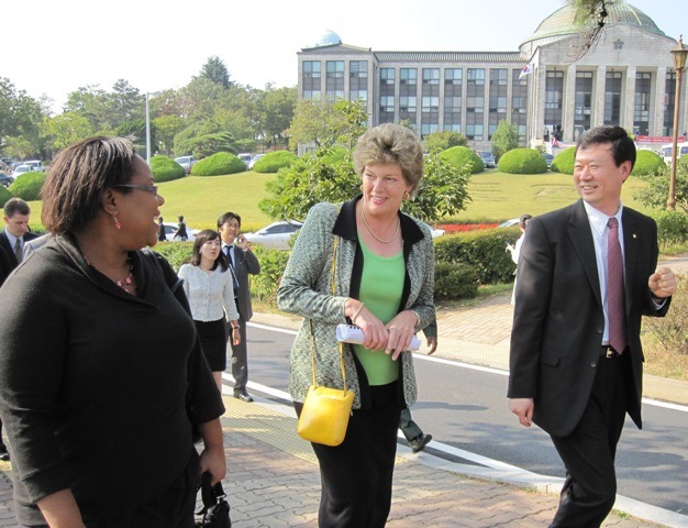 I met with Gyeongbuk Governor Kim Kwan-yong and Daegu Mayor Kim Bum-il, and heard their plans to promote economic development in the region. Gyeongbuk aims to be a global leader in the development of green technologies and renewable energy. In recognition of this leadership, Daegu will host the 2013 World Energy Conference. Daegu has also embarked on a plan to become a center of cutting-edge medical research and high-tech medical equipment development. Like much of