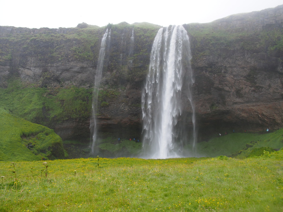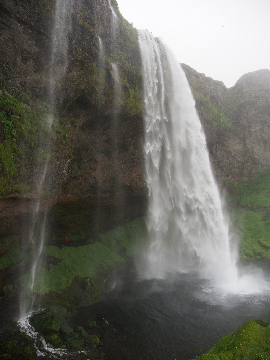 폭포 뒤로 사람들이 지나가고 있다.